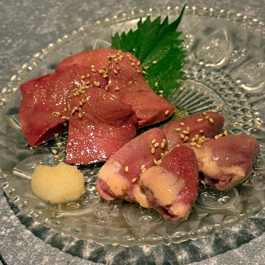 お店おすすめのレバハツ刺し。新鮮で血の臭みもなく最高に美味しい!